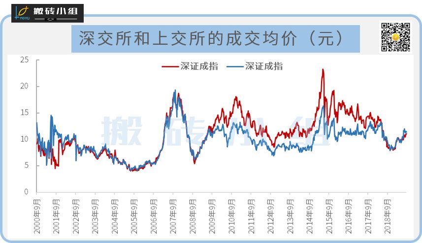 对比上证综指和深证综指,可以发现深交所的每周成交均价在2009年末开始逐渐超过上交所,大家稍微一思考,就会知道,这是因为创业板的出现。目前来看,深交所和上交所的成交均价基本在同一水平。