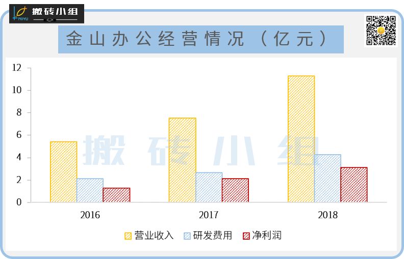 纵向来看,公司收入和利润最近几年迅速增长,净利润两年增长了140%。整体业务的毛利率在88%左右,尤其是产品使用授权的毛利率保持在了95%以上,比茅台挣钱还容易。金山办公在研发上的投入也很大,每年的研发投入都远超净利润,2016-2018三年的研发投入累计超过了9亿。