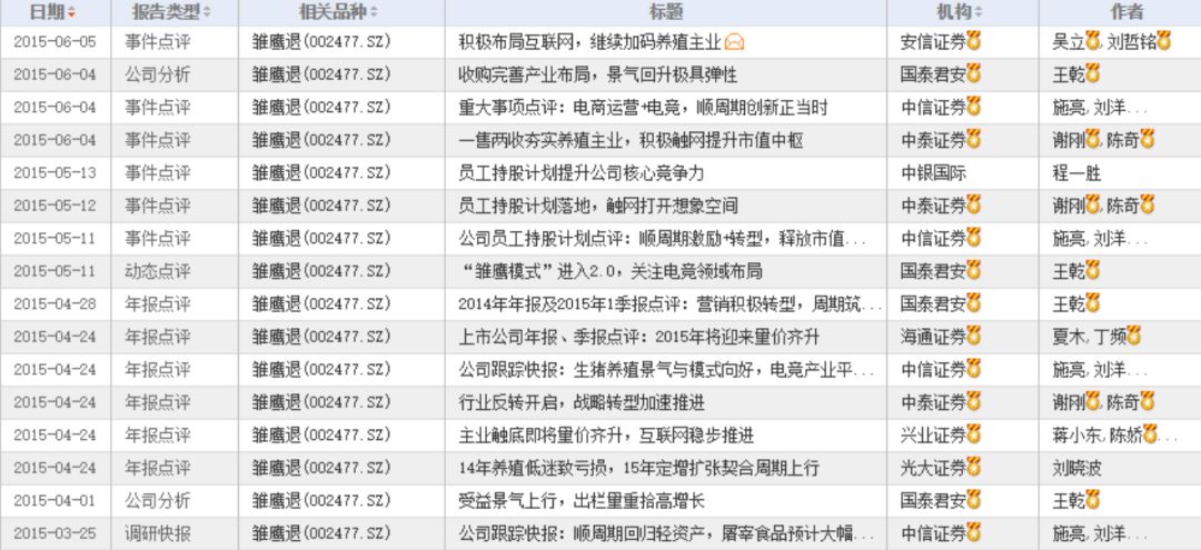 最初的并购给雏鹰农牧带来了业绩上的显著改善,雏鹰农牧当年的增发也吸引了很多机构,当时券商给的研报都是“雏鹰模式进入2.0”、“收购完善产业布局”、“积极布局互联网,继续加码养殖主业”这种风格的,这里面的很多分析师还都是上榜新财富的分析师。