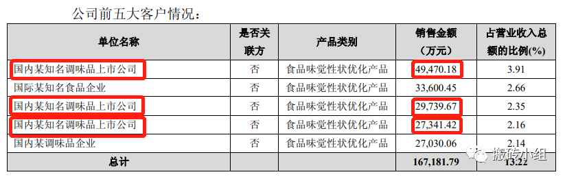 在公告里,公司给出了自己去年的前五大客户和相应的采购额。里面着重提到了相应的三家“知名调味品上市公司”,去年的采购金额都在2.5个亿以上,在国内的调味品上市公司里,稳稳地进入前五大供应商基本是没什么问题了。