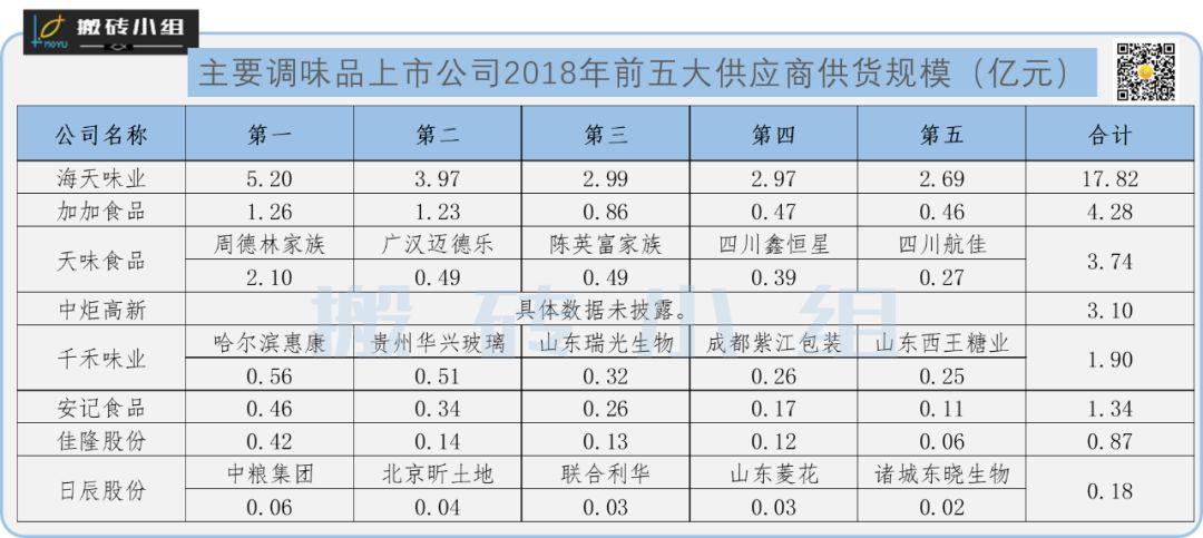 去年前五大供应商供货规模在2.5亿以上的只有4家,除去披露了具体公司的天味食品,剩下的依次是海天味业、加加食品和中炬高新。