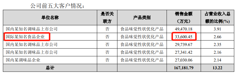 上市公司的公告里,提到了自己的主要海外客户,里面有一家“国际某知名食品企业”,产品类别是“食品味觉性状优化产品”。和前面梅花生物披露的第二大客户“国际某知名食品企业”看起来很像,基本可以确认是同一家,去年的采购规模是3.36个亿。