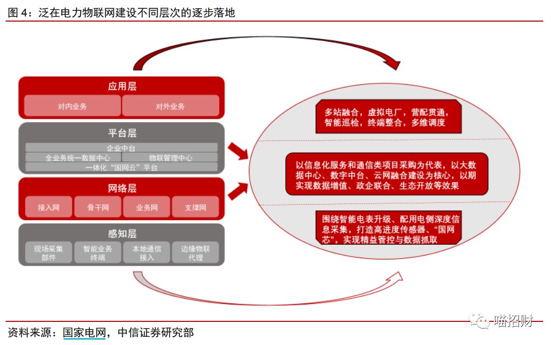 物联网的建设一般分为4个层,感知层、网络层、平台层和应用层,在建设的时候一般是以感知层首先爆发订单,智能电表已经率先启动了,后续可以在有订单的感知层公司内寻找机会。
