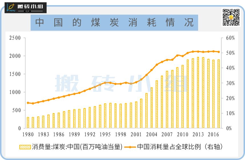 首先可以看到我国的煤炭消耗占到了世界消耗量的一半,但是石油消耗量只占了14%,这背后的原因是我国的能源格局是“多煤少气贫油”,煤炭才是国内目前主要的一次性能源。纵向来看,从1980年到2017年,我国的煤炭消费量翻了6倍多,占世界煤炭消费量的比例也从不到20%上升至了50%。