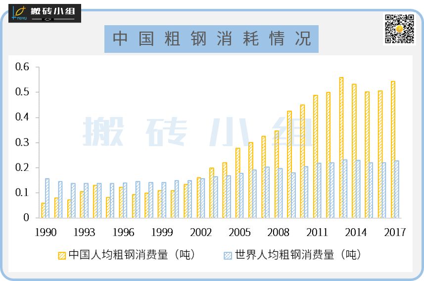 我们换个角度,用人均消费量来看看国内钢铁的消耗情况。我国的人均粗钢消费量在1990年时为0.06吨,还不到世界平均消费量的一半。到2017年,这个数字达到了0.54吨,增长了821%,比世界平均消费量的两倍还要多。