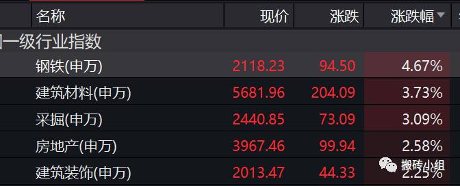 今天涨幅前五的行业分别是钢铁、建筑材料、采掘、房地产、建筑装饰,一眼看过去,基本都是估值相对较低的周期板块。