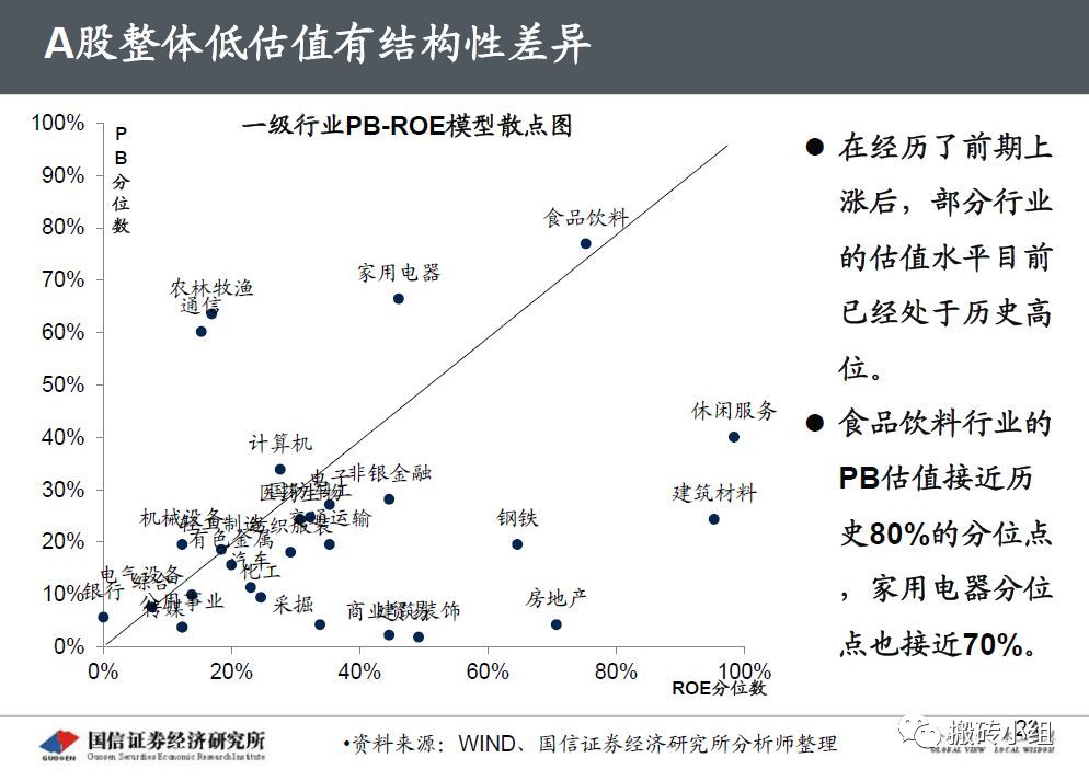 小组曾经给大伙分享过王牌基金经理的选股利器——PB-ROE模型,下面这张图是小组三个月之前分享的A股行业估值分布图,对照今天的市场走势来看看,PB估值处于相对低位,ROE处于相对高位或者有改善预期的行业今天表现都不错。
