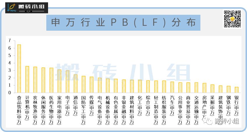 这些行业的共同特点就是估值非常低,从行业市净率PB(LF)来看,估值相对较低的行业分别是银行、钢铁、建筑装饰、采掘、房地产,其中估值最低的三个行业PB均在1以下。而相对的,食品饮料、计算机、农林牧渔等行业估值相对较高。