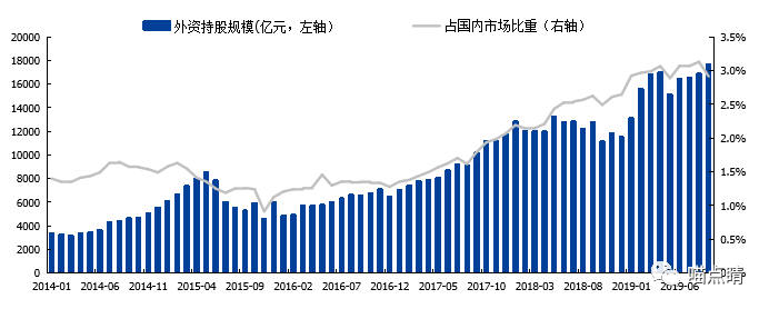 上图可以看出,外资近年来一直在买买买,不过占比也就3%左右,这个数据大家伙可能之前是没概念的,如此看来,未来增长空间还是比较大的。