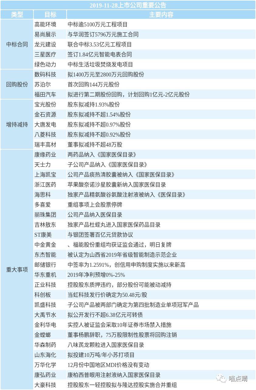 1、三星医疗:公司与印度JNJ公司签署了一项日常经营合同,由公司生产并向JNJ供应智能电表,合同金额约1.84亿元,占公司2018年营业总收入的3.13%,将对公司经营工作和经营业绩产生积极的影响。