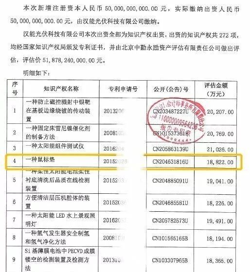更让人惊了个呆的,是最近网上爆出的汉能500亿知识产权增资的资产评估清单。