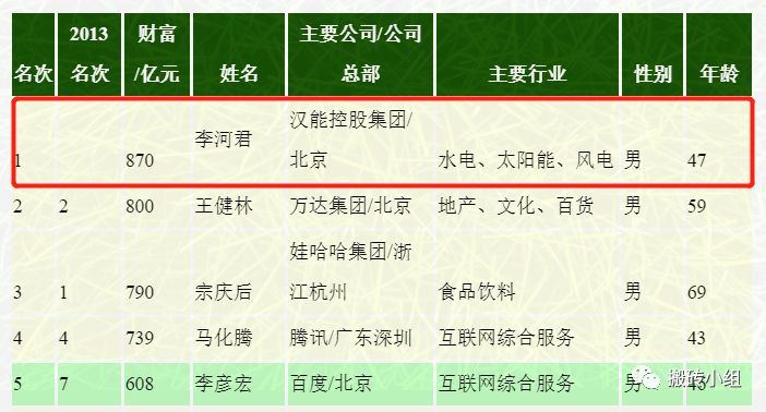 李河君正式成为首富是在2014年。那一年,一直名声不显的李河君,依托水电和光伏为主的汉能集团,以870亿的身家,突然杀出,一举问鼎《新财富》中国首富的宝座。并在一年之后,身家暴涨近800个亿,以1655亿元的巨额财富再次蝉联中国首富,惊掉了一地的眼球。