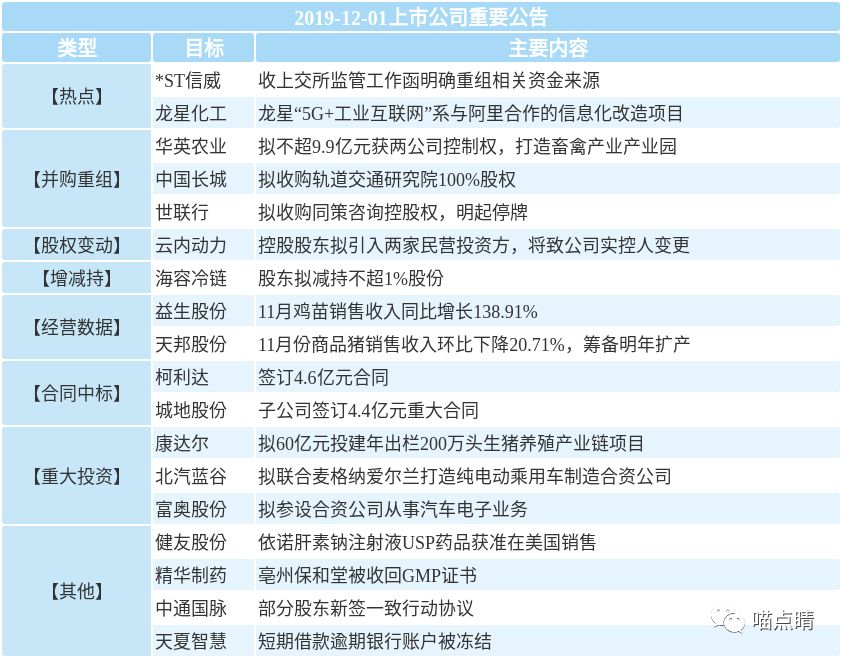 3、依米康:公司与腾龙控股签署战略合作框架协议,协议中腾龙控股预计未来3-5年的机电设备投资总额不低于200亿元。公司表示,基于腾龙控股的业务规模及能力,预计本次战略合作,将会对公司未来业绩产生积极影响。