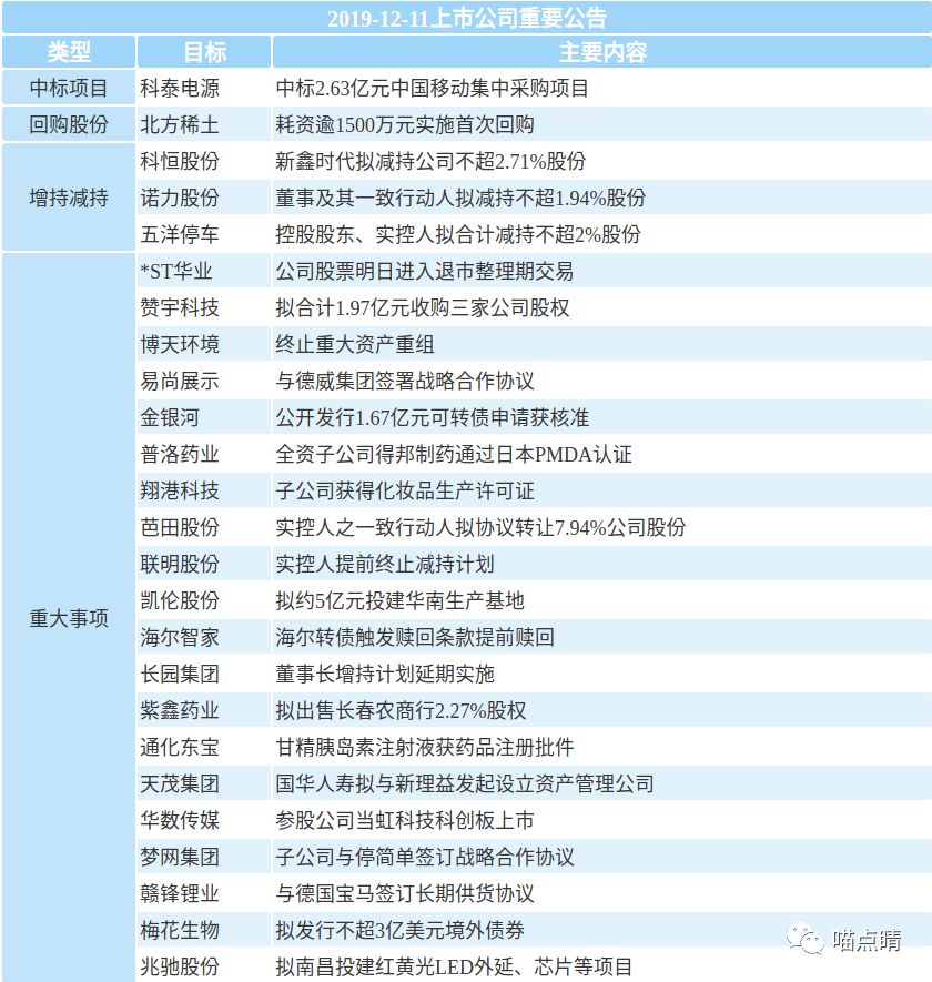 1、赣锋锂业:公司及全资子公司赣锋国际与德国宝马签订《长期供货协议》,协议约定,在2020年-2024年,公司将向德国宝马指定的供货商供应锂化工产品,并且数量和品种均以确定,价格依据市场价格变化调整。本合同将在相应履行年份确认收入,对公司未来的经营业绩产生积极影响。