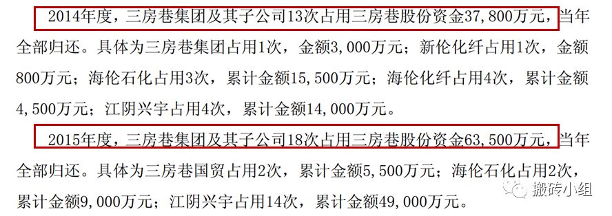 2015年度,三房巷集团及其子公司18次占用三房巷股份资金6.35亿元。