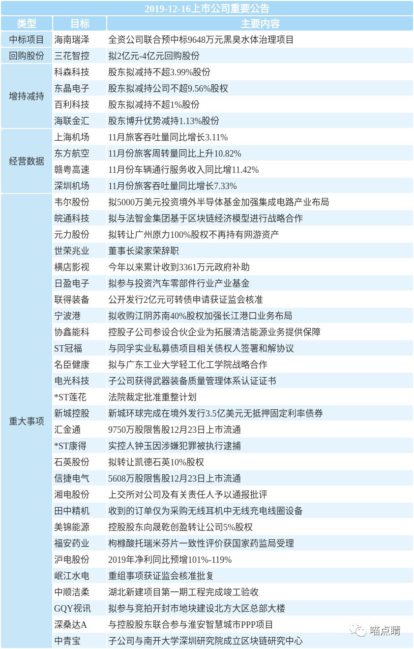 1、沪电股份:公司发布了2019年报预告,预计盈利11.5亿元至12.5亿元,同比增长101.60%-119.13%,公司经营情况良好,产品结构、运营效率等也得到进一步优化,毛利率较上年同期亦有所提升。