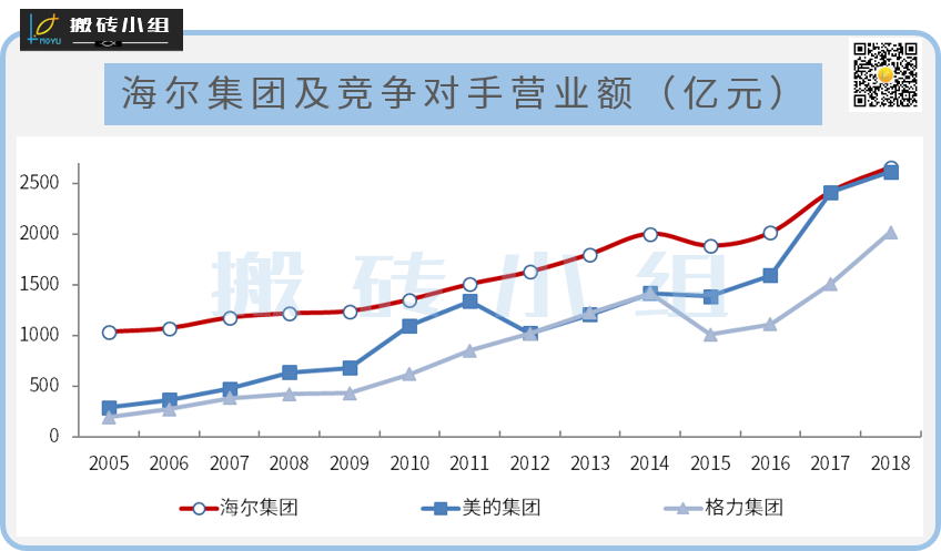从这些数据对比上来看,海尔的起点要高于格力和美的,但是在发展的过程中逐渐被美的和格力追赶甚至超越了。