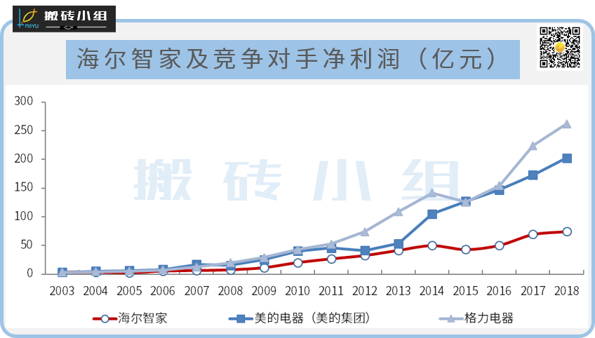 2003年,三家公司的净利润分别为:海尔智家(3.69亿元)>格力集团(3.37亿元)>美的电器(3.19亿元);2018年时,排名变成了格力电器(262亿元)>美的集团(202亿元)>海尔智家(74.4亿元)。