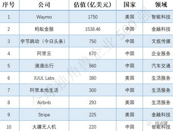 4、近日发布的《2019全球独角兽企业500强发展报告》显示,中国全球独角兽企业500强有217家,有45家入围前100名,有6家入围前10名,数量和估值均居世界首位。前十名榜单如下,估值加起来达到了惊人的6686亿美元。