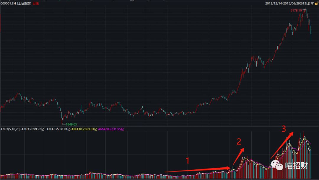 不过,股市要整体走牛,光靠存量还是不够的,要出现大量的增量资金踊跃入场,才能推得动指数的快速上涨,就比如2014年期间的1号区域(7-11月)沪深两市加起来也才4000亿上下的日成交额,指数缓慢推升;到2号区域(2014年12月)海量资金开始入市,沪深两市日成交额经常超过了万亿,沪指两个月时间就从2400一带飞涨到3400附近;而到3号区域(2015年3-6月),尤其是五六月时,沪深两市单边成交额就能达到万亿。