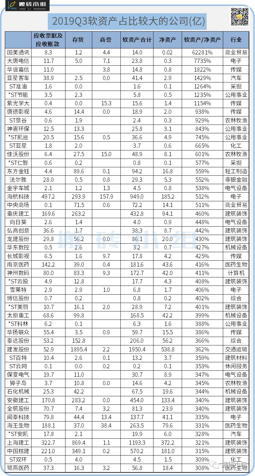 小组从资产软的角度出发,以【商誉+存货+应收票据及应收账款】占净资产的比值来初步筛选了一下软资产预警清单: