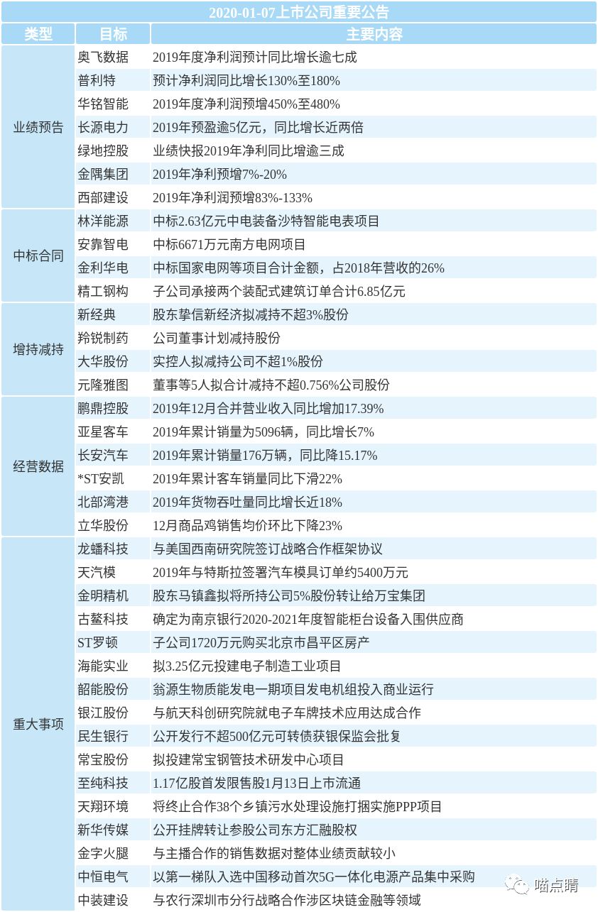 4、金隅集团:公司预计2019预盈35亿元-39亿元之间,同比增加7%-20%。公司表示,金隅冀东战略重组顺利完成,重组效应持续显现,重组红利进一步释放。同时,公司房地产业务积极应对市场变化,房地产业务利润较去年同期有所增加。