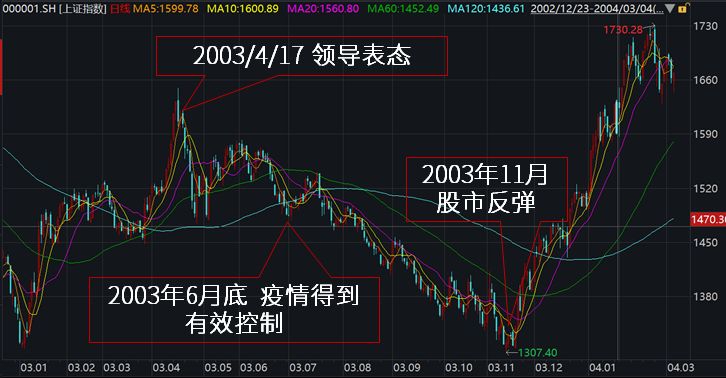 更细的复盘可以发现,疫情最早发现是在2002年11月,在这之后其实股市并没有受到太大的影响,从2003年初到2003年4月16日,大盘甚至还涨了差不多20%。