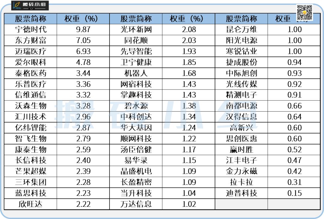 现在主流的创业板指数有两种,一个是创业板指,就是大家平时经常看的那个指数,这是个成分指数并非综指,是由100个综合了市值和流动性的成分股所构成,具体标的和权重如下: