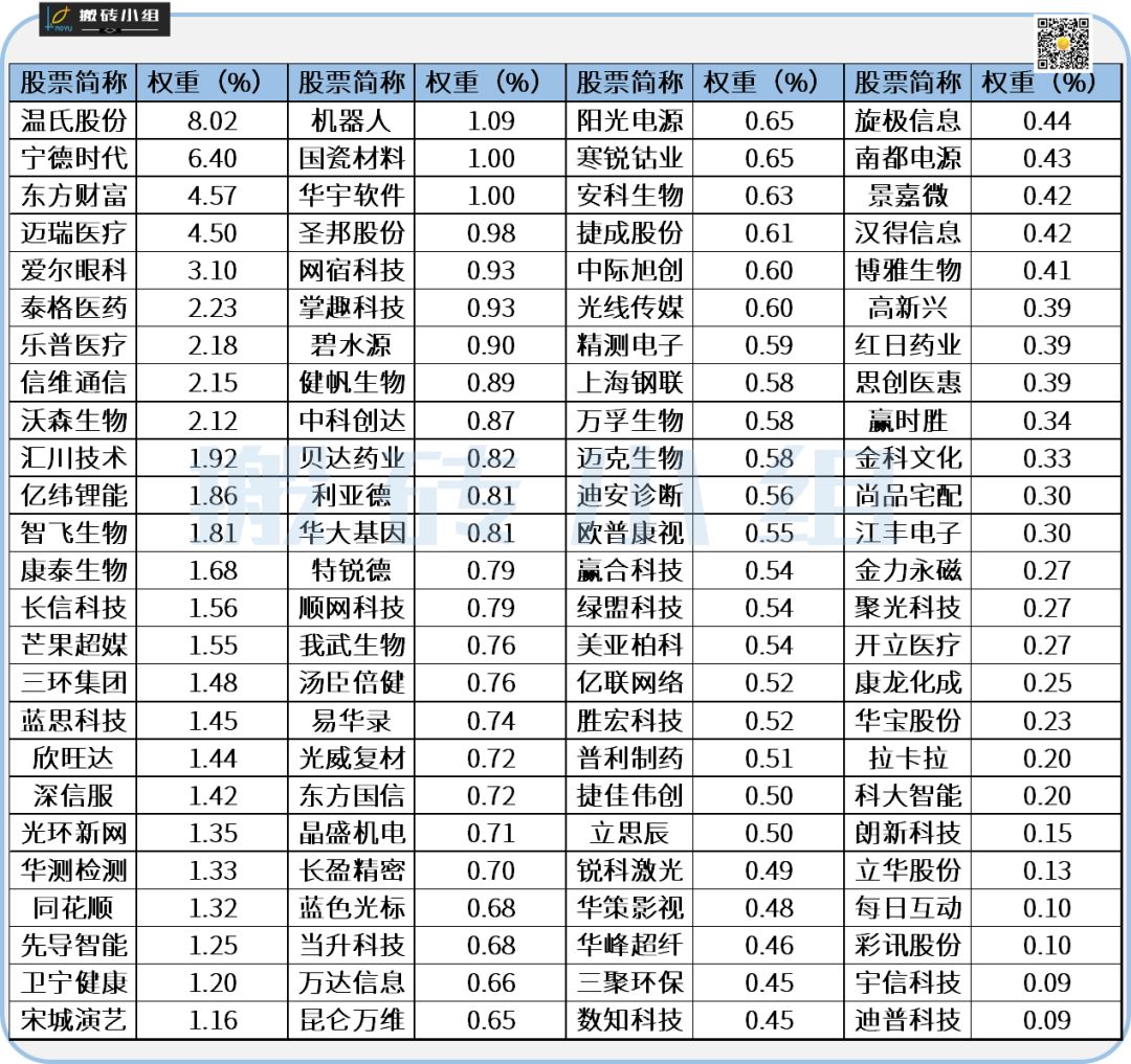 此外,创50还对不符合创业板科技创新属性的公司进行了剔除,这也就是为什么在创50的成分股里面看不到曾经的创业板一哥“温氏股份”的影子,而温氏股份的巨大市值对于创业板指的扭曲,也一直是市场所诟病的,针对这一点创50进行了优化。具体标的如下: