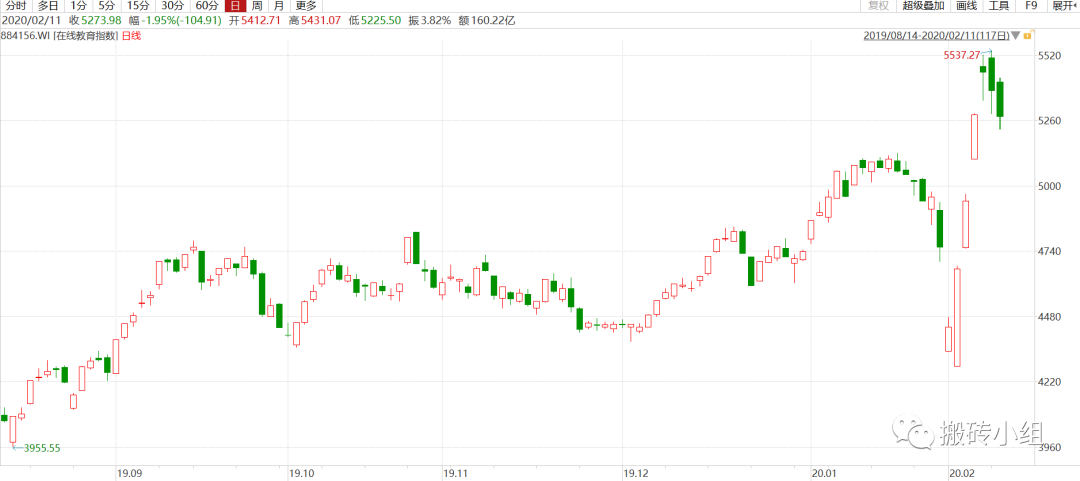 疫情持续之下,国内大中小学都面临着较长时间的停课。在“停课不停教,停课不停学”方向的指导和有关部门的推动下,在线教育这个方向,现在是风口上的猪,是近期最受益的几个方向之一。但市场情绪热成这样子,还是有点出乎小伙伴意料的。