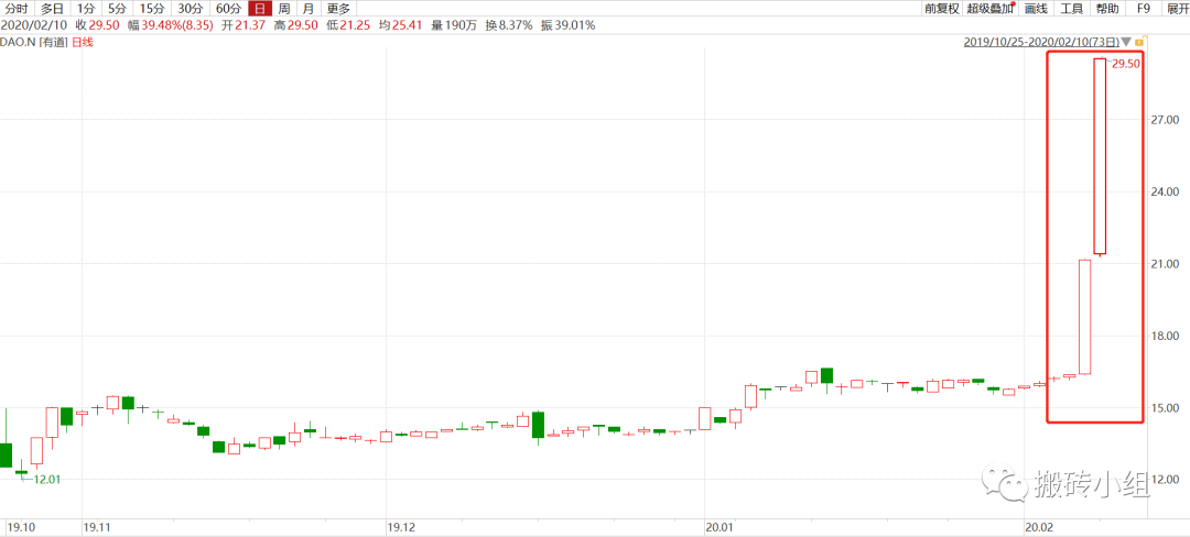 看网易有道这两天80%的涨幅的走势,很像是咱们自己人在大A没炒过瘾,直接去美股搞正宗的在线教育股去的,把老外都干得有点懵。。