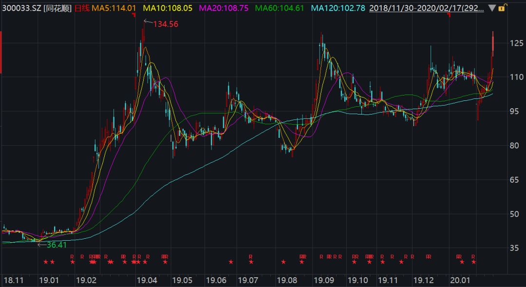 如果同花顺冲过去了,顶在哪,谁也不知道,跟着均线走就好了。5日线和20日线,破了就走。