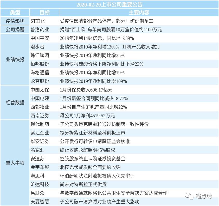 1、中国平安:公司2019年实现净利1494.07亿元,同比增长39%,因公司营运利润的持续增长及对平安未来前景充满信心,拟每10股分红13元,加上已派发的中期股息每股现金0.75元,全年股息为每股现金2.05元,分红总计约373亿元,同比增长19.2%,过去5年分红年复合增长率达40.1%。