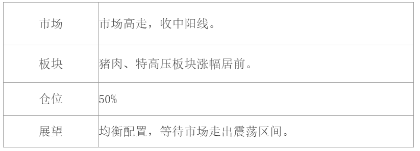 今天市场高开以后震荡高走,在蓝筹的带领下上证留下了个跳空缺口。最近这几天盘面很明显有切换的味道,科技不再受到大家的热烈追捧,资金反而去找低位低估值的方向,目前看来最近切换均衡配置的战术是对的。