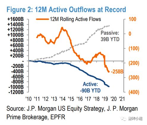 光是去年中旬,根据摩根大通的估算,指数型基金和交易所交易型基金(ETF)就已经占据美股资产的60%,同时追随趋势性投资的量化基金也占据了美股投资市场份额的20%。两者共占据美股投资市场的80%之多。