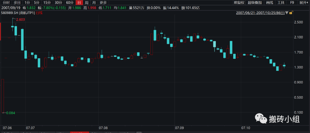 作为我国第一只以现金行权的股改权证,南航JTP1上市首日就迎来了十倍涨幅的奇迹,此后更是连续涨停,最高涨至2.603元。