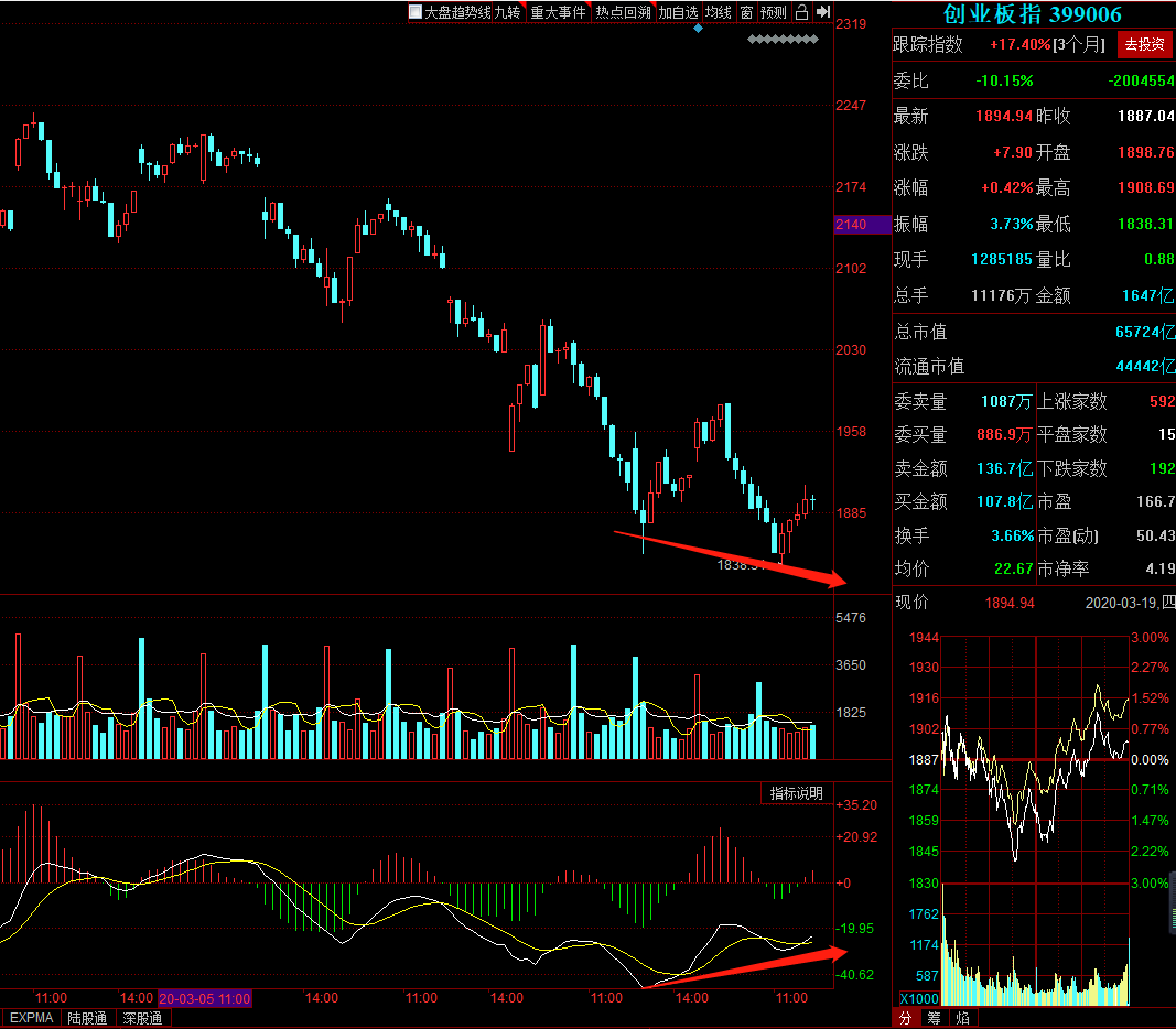 分指数来看,最近这几天以沪深300为代表的权重指数杀跌比较狠,这里还没有减速的意思。但是看创业板指这里已经有个30分钟的背离,这里是有反弹的基础了,但是能不能向上做一笔比较有力度的反弹,还要看拿着钱的愿不愿意买。