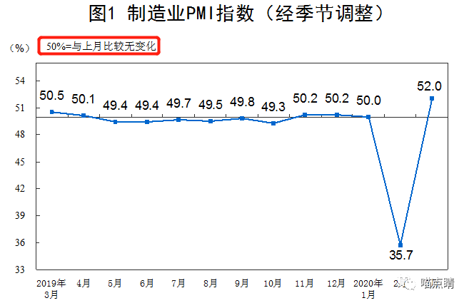 很多人有点懵所以简单科普下,PMI是环比指数,但那个52%并非表示环比增长值,图里特意圈出来了,可以把50%当作中轴,以上代表比上个月好,以下代表恶化。