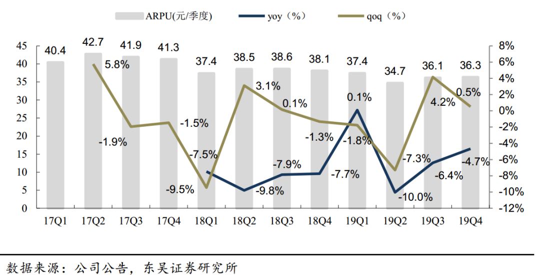 但是影响递延收入的不只有量(会员人数)的因素,还有价(ARPU)和订阅时间。从价格的因素来看,爱奇艺的每用户平均收入(ARPU)是下降的。