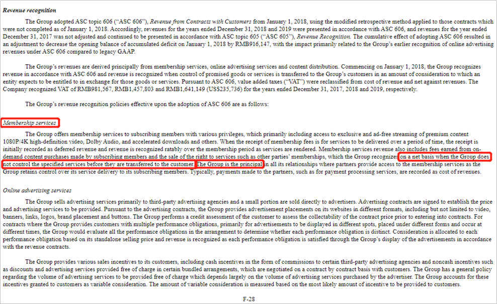 剩下就是包含给小米合作分成部分的爱奇艺收入,这里的关键是按全额算收入还是按扣除合作伙伴分成后的净额算收入,这更多的是一个会计准则的问题,根据美国对应的收入确认准则ASC606关于委托人和代理人的判断,如果属于实质提供服务和货物的一方,则属于委托人,应当按照全额法确认收入。