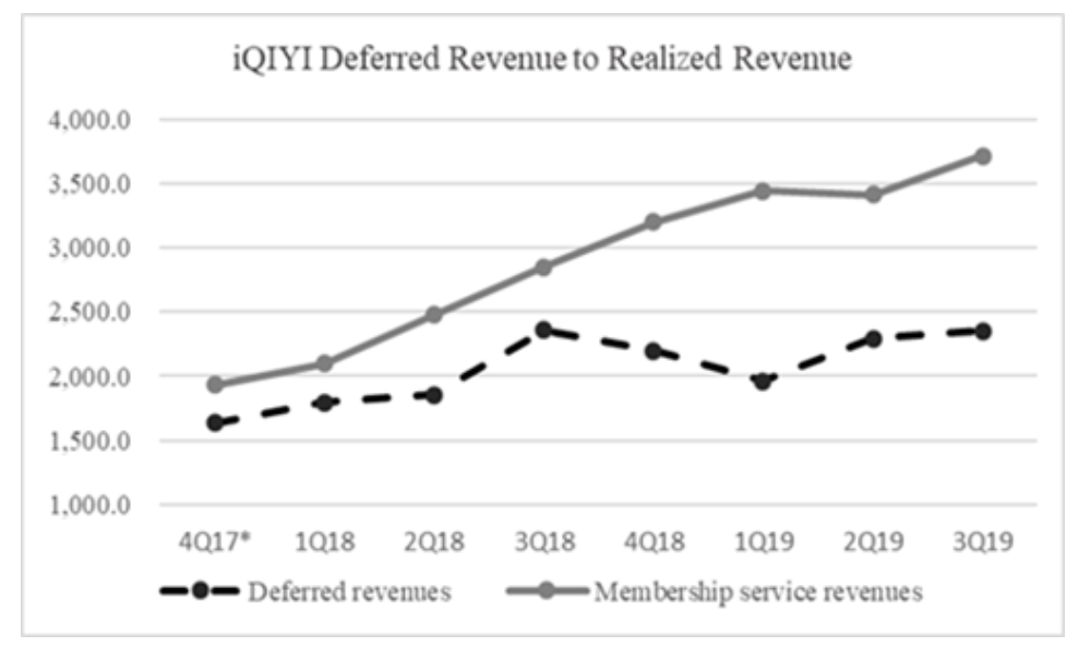 报告还试图从递延收入的角度说明爱奇艺夸大了收入。递延收入这个科目记录的是客户已预付的将在未来交付的服务。就像爱奇艺用户买了一年的会员,现在只用了1个月,用掉的那个月确认收入,剩下11个月记入递延收入。