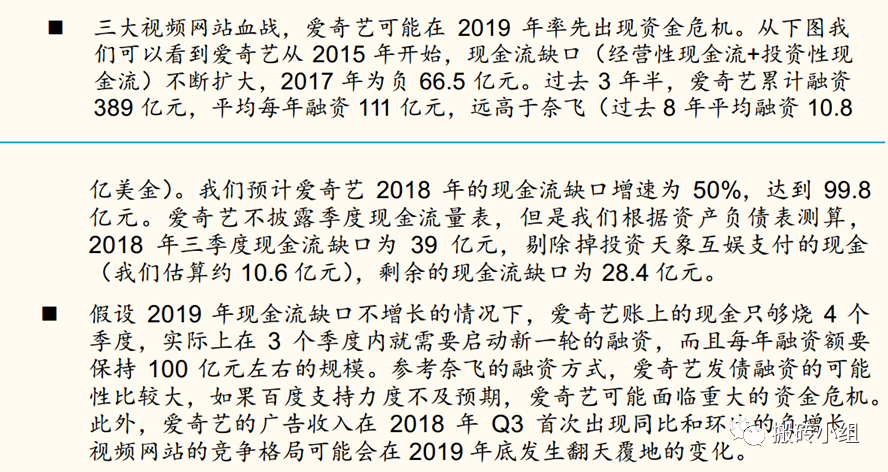 客观来讲,因为烧钱的速度太快,这个行业都很缺钱,不光是爱奇艺。早在2018年底,就有国金证券的分析师在报告中计算了爱奇艺的资金情况,如果在2019年不融资,那么它就有可能是三大视频网站中第一个倒下的。