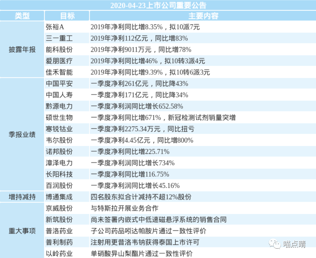 3、温氏股份:公司2019年实现营收731.2亿元,同比增长27.75%;净利润139.67亿元,同比增长252.94%;每股收益2.66元。公司拟每10股转增2股派发现金红利10元(含税)。公司今年一季度实现净利润18.92亿元,同比扭亏。猪大哥还有什么好说的呢?