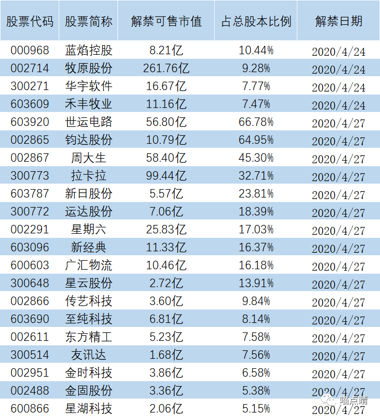 不过考虑到你们都太忙(lan),所以我帮大伙整理了未来一段时间解禁占流通股比例较大的公司。规矩不变,在看超过999,我会留言置顶关键词,回复至消息栏自提宝贝。
