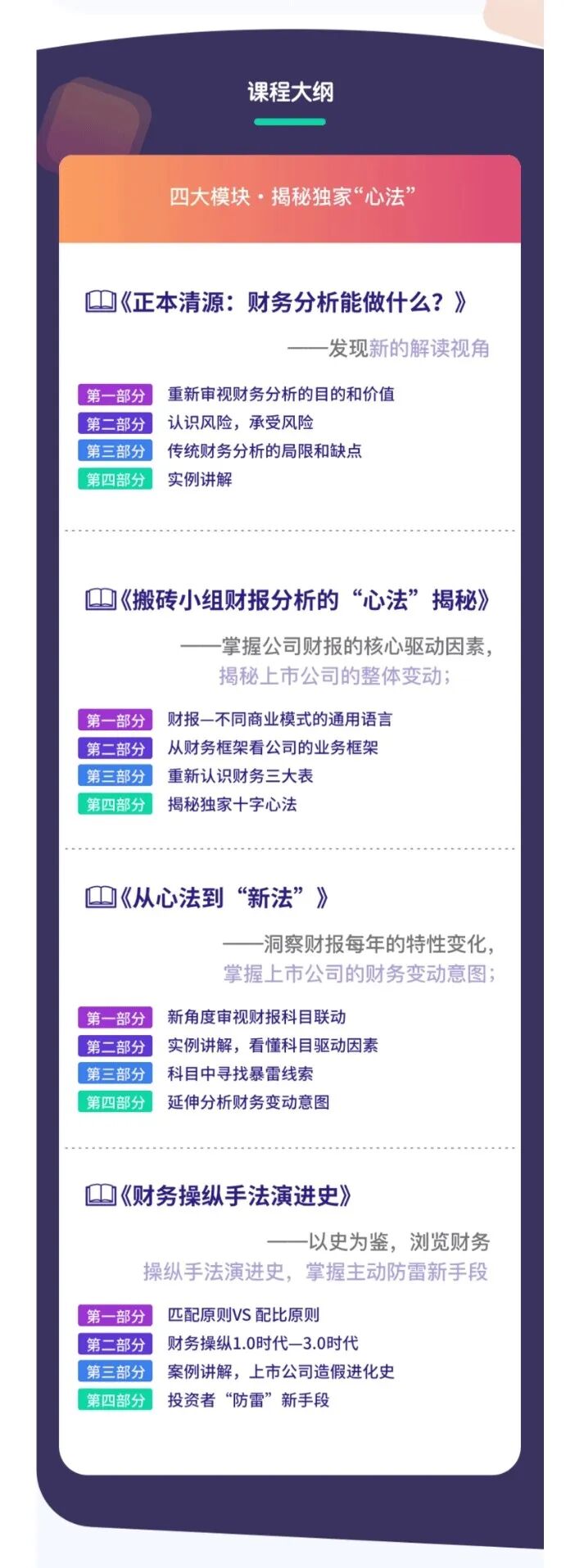 小组财报课程来了 2020年4月27日 / 如果我没猜错 你在建仓前一定会问 “这公司不会暴雷吧?” 想想曾经的二康 都是风靡一时的大白马 一旦财务风险高企的丑态暴露 股价就是止不住的跌 企业展示出来的“美貌” 往往都是加了n层滤镜+美颜效果的 大家都想提前识别风险 而识别风险就离不开财务报表 因为我们想了解的绝大部分信息 都藏在财务报表里 财务框架就是企业业务框架的抽象 投资者要做的 就是读懂公司的商务语言 观察财报科目的联动 分析科目变动的意图 掌握住诀窍 就能轻松给企业报表“卸妆” 这里隆重给大家介绍下 小组精心准备的 【财报分析心法】和【财报分析课程】 先奉上“财报季”特别优惠码 后面再更详细的介绍: 【财报分析心法】 【财报分析课程】 【财报分析心法】 是一套由小组倾力打造 服务百亿级头部机构的内部资料! 专为投资者量身打造的独家心法! 【财报分析课程】 带你从基本的会计报表出发 了解会计科目 读懂财务报表 避免投资踩坑! 如果你想入门财报分析 这份课程是不错的选择! 有任何关于课程的疑问 都可以加小姐姐微信了解! 上一篇 下一篇