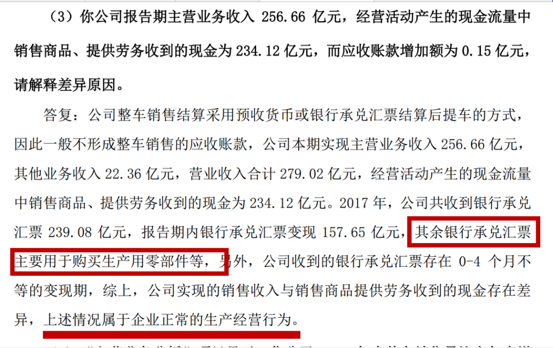 在2018年,监管部门就关注到了这个问题,并发出问询,一汽轿车给出个一个解释:我们把收到的部分银行承兑汇票直接当成现金支付出去啦,这是企业正常的行为。
