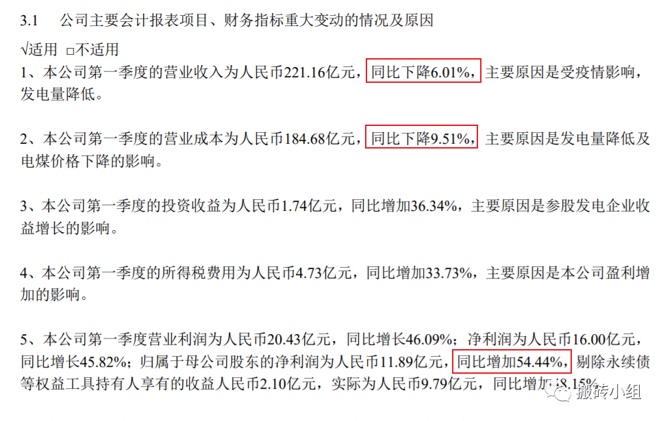 华电国际昨晚发布了一季报,一季度营收同比-6%,但归母净利润+54%,赚翻了。当期公司费用端的变动幅度有限,导致业绩大增的核心原因在于营业成本的下降,因为发电量降低和电煤价格下降,公司营业成本同比-9.51%。这个业绩弹性大伙感受一下。