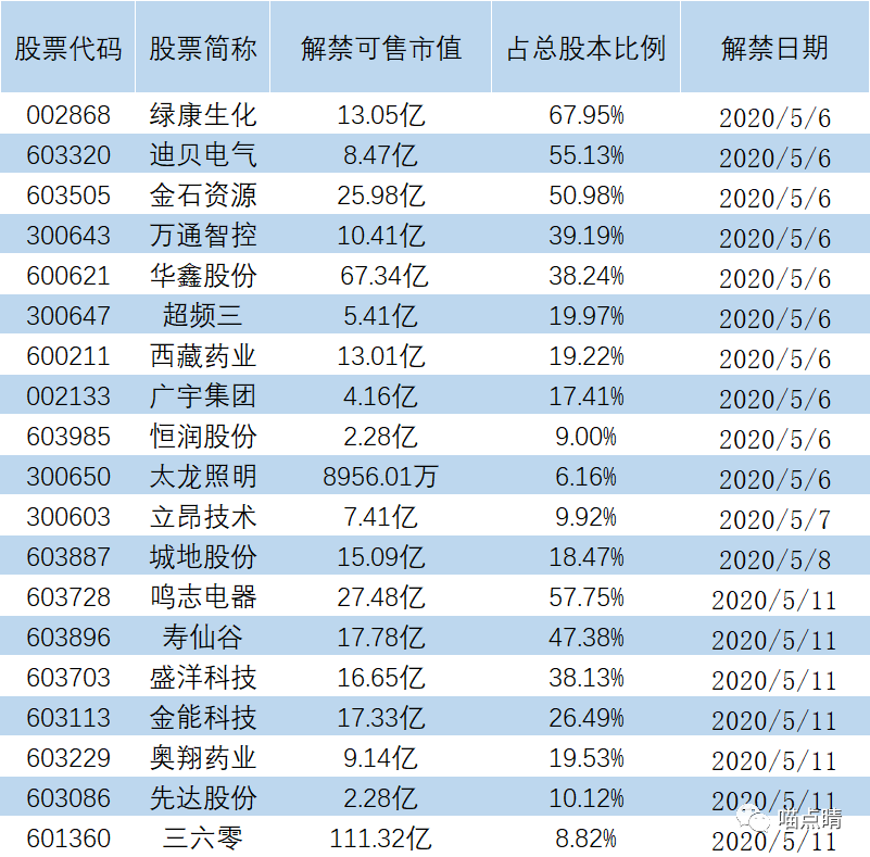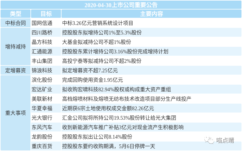 6、晶方科技:大基金拟计划自2020年5月27日至8月26日减持不超过229.68万股,即不超过公司总股本的1%,大基金目前持有公司 9.44%的股份。此前,兆易创新、国科微、汇顶科技等公司也都遭到了大基金的减持,算是常规操作。上一波减持直接推升了二期概念,这事如何解读完全取决于市场热度。。