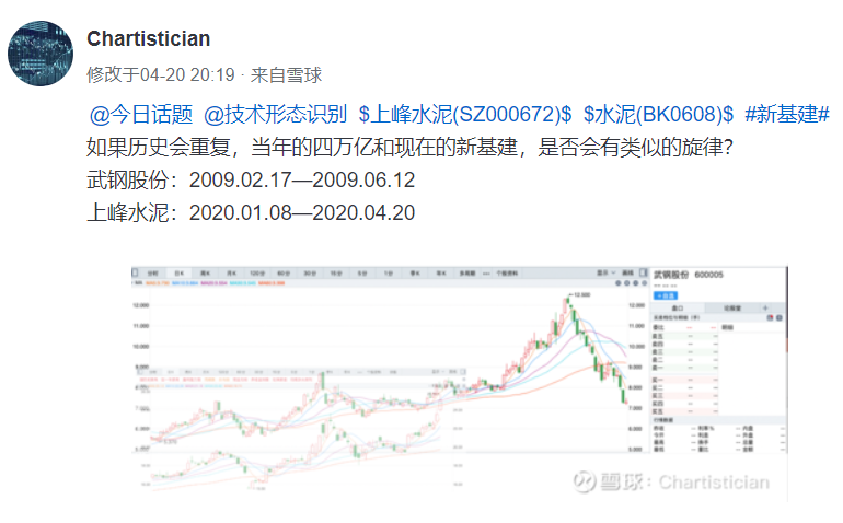 今天水泥板块走的特别坚决,你要说没人看到底牌,我是不信的。板块里面很多公司都创了新高,一个月前,我们对比过2009年的武钢和如今的上峰水泥,说的是在大环境类似的情况下,周期股的走势出现了惊人的相似。
