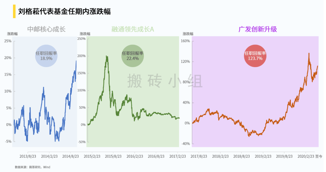 2013年8月,刘格菘成为中邮核心成长的基金经理,任职约1年,回报率约19%,表现中规中矩,不过当时还是跟邓立新联合管理的基金,市场环境还没到科技股大行其道的时候。